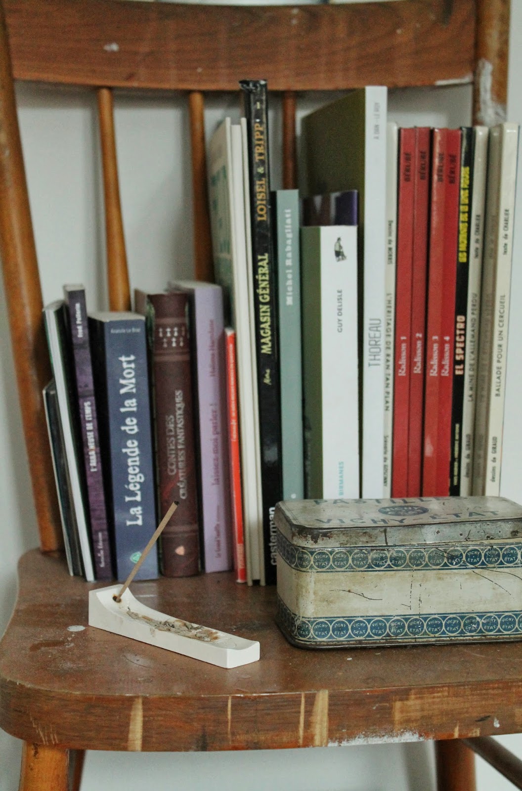 À priori, ça peut paraitre un peu fou, et pourtant : ces étagères tiennent (depuis deux ans!) grâce à de la corde soutenue par des petites punaises bien simples. Il suffit de lier deux bouts de bois avec la corde. Et oui !